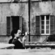 Die Kirche Santiago (Iglesia de Santiago Tlatelolco) auf dem Plaza de las Tres Culturas/ Plaza de Tlatelolco. Ein Paar überquert den Platz. Im Vordergrund sitzt ein Mann auf einem Holzstuhl, neben sich eine Kamera auf einem Stativ. Rückseitenbeschriftung: “1975. Kirche Santiago. Fotograf. sonntags”