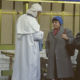 Frauen in traditionellen Gewändern, sitzend auf dem Boden. Sie blicken alle in die gleiche Richtung, bis auf eine Frau, die in die Kamera schaut.